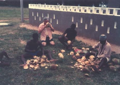 ihre Tore schließen und Geschäfte die noch weiter machten hatten fast nichts mehr zu verkaufen. Wir waren alle besorgt über die Situation. Ich fasste den Entschluss mit einer Farm zu helfen Mais, Bohnen, Gemüse und andere Sachen zu pflanzen. Im Dezember 1983 begann ich damit. Wir bekamen ein größeres Stück Land, aber es war Semi-Savanne. Da wir in der Nähe des Volta Flusses waren pumpte ich Wasser über eine lange Leitung in einen Weiher. Die Pumpe und die Rohre kamen von Deutschland und waren ein Geschenk unserer Generalleitung in Rom. Von diesem Teich konnten wir dann Reisfelder bewässern und andere Flächen irrigieren. Mein Bruder Matthias kam 1985 auf seinen ersten Besuch und half mir in vielen Dingen. Er brachte meinen Jungens das Elektroschweißen und andere Schmiedearbeiten bei. Nach getaner Arbeit flogen wir beide nach Deutschland, Matthias zurück zu seiner Familie und ich in Urlaub.