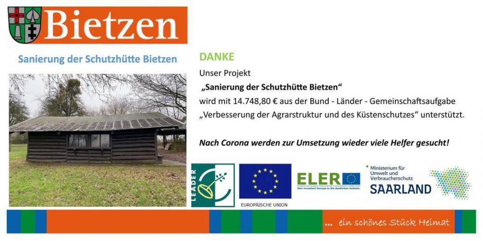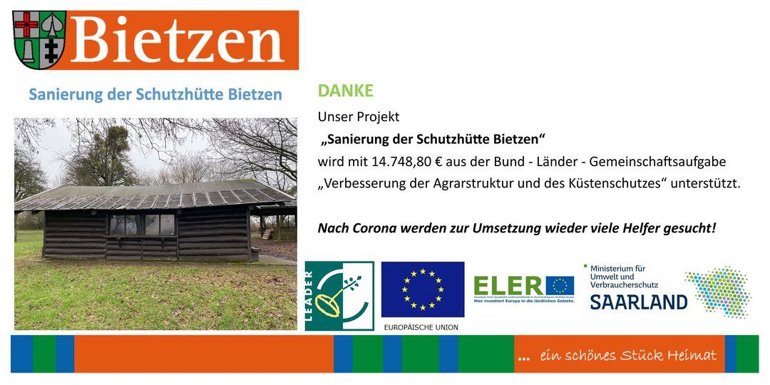 Unser Projekt „Sanierung der Schutzhütte Bietzen“ wird mit 14.748,80 € aus der Bund - Länder - Gemeinschaftsaufgabe „Verbesserung der Agrarstruktur und des Küstenschutzes“ unterstützt.